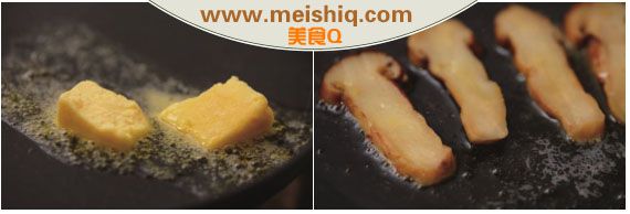 将松茸片入锅,反复煎至表面金黄,散发出松茸香味即可出锅装盘。