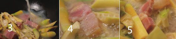 入咸猪肉、笋一起煸炒,让笋均匀沾满底油。