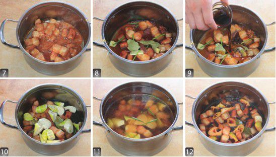 2.煸炒五花肉时,可用小火将肉中的油逼一些出来。而最后加水时,一定要用开水,这样炖煮出来的肉会更弹牙。