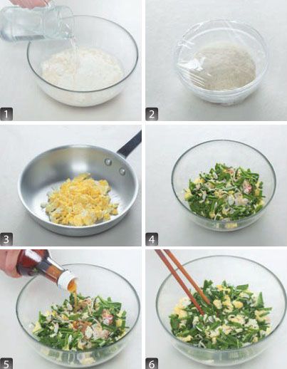 鸡蛋碎、韭菜段和海米放入盆中混合,加少许盐、鸡精、十三香粉、香油拌匀,调制成馅料。