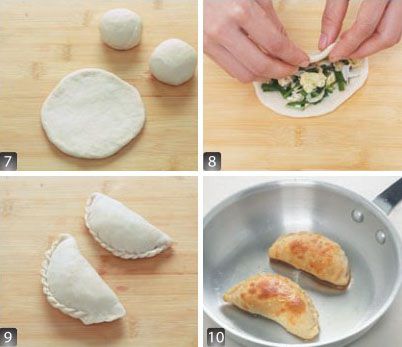面团揉成长条,揪成小剂子,擀成圆片,包入调好的馅料,对边捏合并捏出花边。