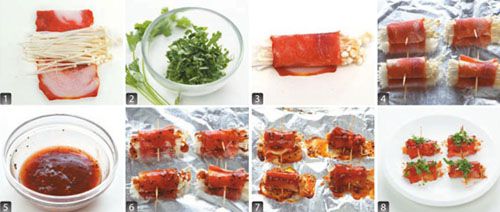 烤箱预热至 180℃,将金针菇培根卷放入烤箱,正反面各烤 10 分钟,取出后撒上香菜碎即可。