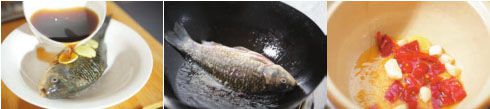 泡红辣椒,切片、大葱,切葱花、姜,切末、蒜,切块。用刀在鱼两侧划细纹,用盐腌 10 分钟。锅中放底油,烧热至油面起烟,放入鲫鱼炸至金黄,盛出待用。