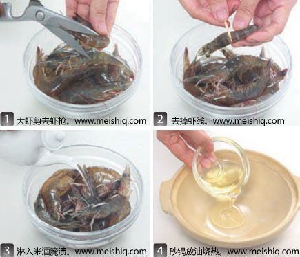 将大虾洗净,去虾肠、虾线,淋米酒略腌备用。