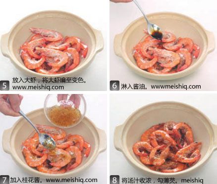 取炒锅,放油烧至温热,放入大虾,待其表面变色后,淋入鲜味酱油和桂花酱炒匀。虾熟且汤汁收浓后,加入少许生粉勾芡即可。