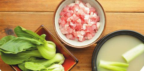 将五花肉去皮切碎、用刀剁成石榴子大小的粒。把枸杞浸泡开,葱姜末打成汁。葱切段一半切末、姜切末、莲藕切丁、油菜心,煮熟。