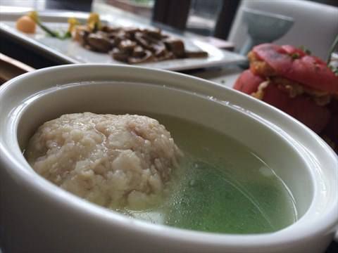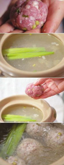 撇去浮油,将肉丸放入另一锅鸡汤加煮熟的油菜心即成。上桌前放入菜心,加入精盐、味精调味即可食用。 口感松软,肥而不腻,营养丰富。