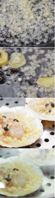 中小火先加热油,爆香姜片和干豆豉,改小火后,调入黄酒、生抽和高汤(水也行)。然后取出姜片,将剩下的豆豉油汁均匀地浇在扇贝肉和粉丝上。