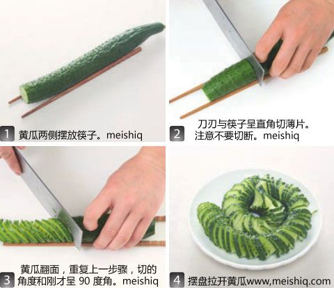 用 2 根筷子摆在黄瓜的两侧,先横切薄片,翻面后再斜切薄片,最后将切好的黄瓜盘入碗中。(切法详见步骤图)