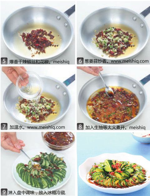 油烧热后放入干辣椒丝、花椒小火爆香,再加入葱花、姜末、蒜蓉炒香后倒入适量温水,加入生抽、盐、醋、蚝油、黄酒,大火煮开后转小火煮 5 分钟左右,让酱汁更入味。将酱汁淋到盘好蓑衣黄瓜的碗中,放入冰箱冷藏半小时左右即可。清淡爽口,酸甜稍辣、清热利水,解毒消肿,生津止渴。主治身热烦渴,咽喉肿痛,风热眼疾,湿热黄疸,小便不利等病症。