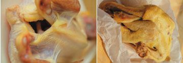 将调好的粉末均匀地抹在鸡皮上。将葱丝、姜丝和八角塞入鸡肚子腌制 30 分钟。