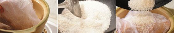 将大粒盐放入沙锅中干炒 10 分钟,将包好的鸡放入盐锅中,把盐均匀地覆盖在鸡身上。调小火烧 30 分钟,中间要将鸡翻转一次。
