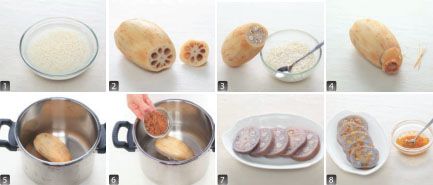 灌入藕孔的糯米要填实,无空洞,可一边填一边用筷子捅。