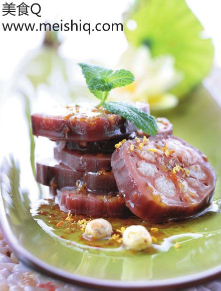去掉牙签、藕节头,切成 1 厘米厚的片,摆盘,淋上糖桂花即可。