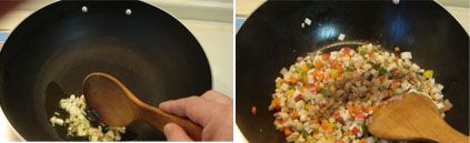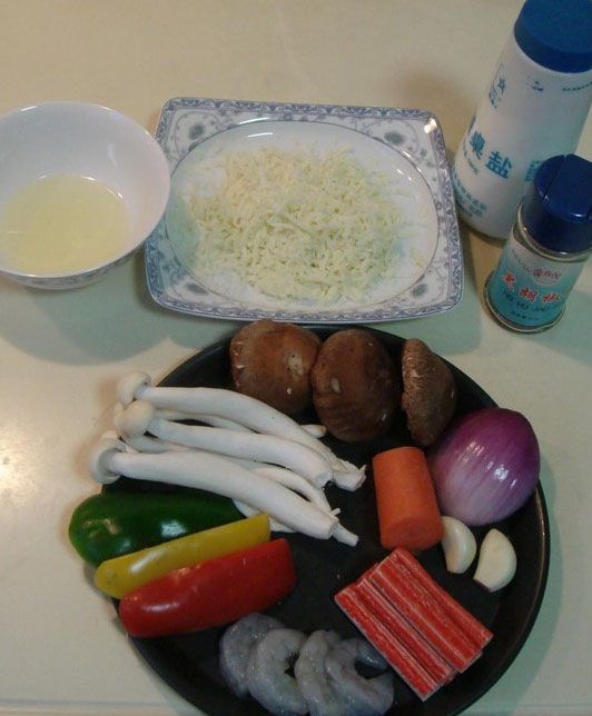 把虾仁和鲜鱿鱼上火用洋葱和蒜煸炒至入味待用。青尖椒切成圈状。把金枪鱼的罐头打开待用。