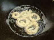 将油倒入锅中加热至六成热左右,将鱿鱼圈放入油锅中炸成金黄色即可(可用烘干的菠菜叶装饰)。