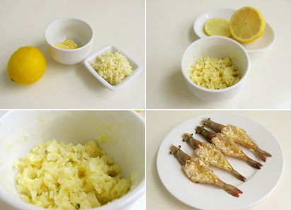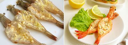 .将制作好的大蒜黄油放在开好的虾背上,放入烤箱以200℃烤5~7分钟即成,用生菜及柠檬片装饰即可。