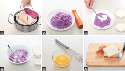 芋泥中加紫薯丁、白砂糖及淡奶油,拌匀做成馅料。鸡蛋打成蛋液。