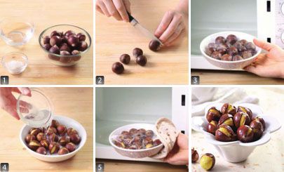 将板栗放进可用于微波炉的容器中,覆上扎过若干透气孔的保鲜膜,放入微波炉高火加热 2 分。