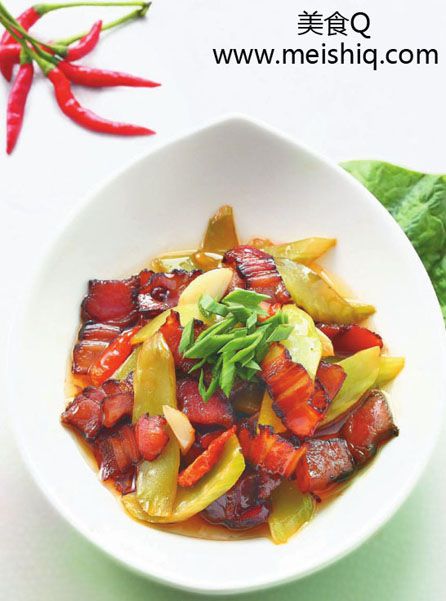 将腊肉洗净,放锅中煮 10 分钟左右,取出晾凉后切成薄片 ;莴笋去皮,切成半厘米厚的斜片 ;干辣椒切段,青蒜切段,姜切片备用。