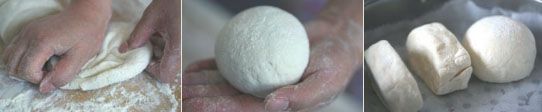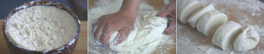 取出醒好的面团,加入碱揉匀。将其搓成较粗条状。