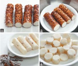 山药不变黑、营养不流失的秘密:拿竹片在山药皮上划一圈再折成小段(别用刀切),这样不易变黑。山药段放沸水中稍煮一下,加少许白醋。若是蒸食,可直接带皮蒸。