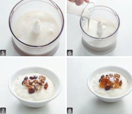 山药洗净、切段(不用去皮),上锅蒸约10 分钟至软。取出,去皮,切成小块,用搅拌机搅打成糊状。