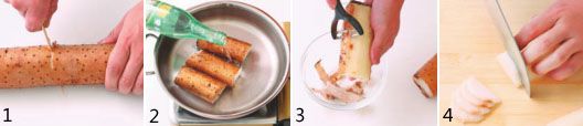 捞出, 放凉, 用刀或削皮器去皮即可。因为表面无黏液,所以不用担心手会痒。山药最外面一圈是熟的,中间还是生的,这样既保住营养还方便切配。