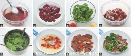 猪肝中加酱油、盐、白砂糖、料酒、淀粉抓匀,腌渍入味。菠菜用加了少许盐和油的沸水汆烫一下,捞出过凉水,沥干。