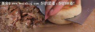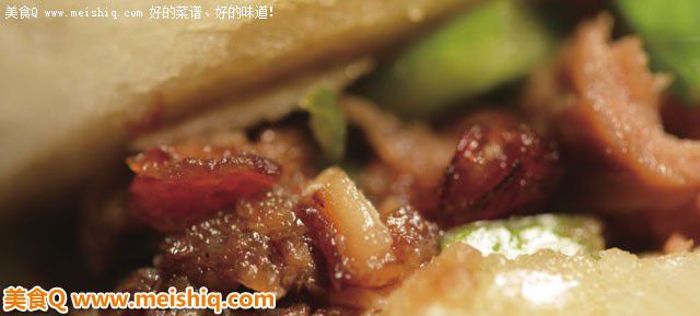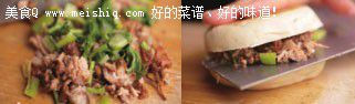 白吉馍中间剖开,加入剁碎的腊汁肉即可。