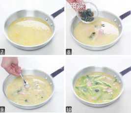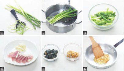 芦笋削去老根, 洗净, 在加盐的沸水中汆熟,切成段,装盘备用。皮蛋、咸蛋黄切丁,咸肉切片,红辣椒切小块。