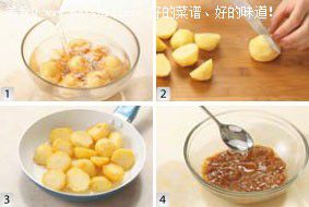 土豆清洗干净后,去掉外皮,如果是很小的薯仔,可以直接对半切开,如果是稍微大一点的小土豆,两次对半切开成四块。黄酱和甜面酱混合后加入少许油搅拌均匀。