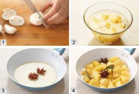 将口蘑去蒂洗净,土豆去皮洗净后切成小块,注意块不要很大,否则不易熟透。土豆切好后,用清水浸泡备用。