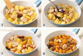 将口蘑放入,放入酱油、老抽、白酒、盐、白砂糖和鸡精,再加入没过食材的清水,大火煮沸后,中火收干汤汁即可。如果不希望土豆太软烂,可以先放入口蘑,在收汤过程中放入土豆,并采用大火收汁,以缩短收汁时间。