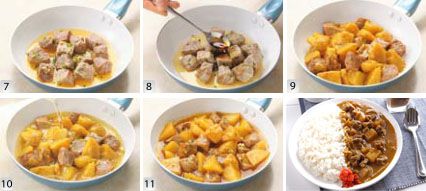 利用煮牛肉的时间,锅中放 2 汤匙油烧至五成热,即手掌在锅上方可以感到明显热气的时候,放入土豆块和咖喱,翻炒均匀。咖喱炒匀之后加适量清水烧沸,不断轻轻搅动,炒至汤汁浓稠,土豆熟透后,将土豆和咖喱盛出。