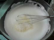 蛋清里加一点点的盐 和一勺糖,用打蛋器顺一个方向继续不停地打。