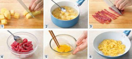 利用煮土豆的时间,将牛肉切成丝,用剩下的 1/2 茶匙盐和胡椒粉抓拌均匀,放入少许料酒腌制去腥。将鸡蛋打散成蛋液,在锅中烧热 1 汤匙油,将鸡蛋炒熟后盛出备用。