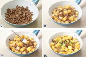 锅中重新放油,将葱末爆香,放入牛肉翻炒至变色,然后加入土豆翻炒。