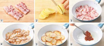 锅中放 1 汤匙油烧至六成热,即手掌放在上面能感到明显热气的时候,放入五花肉片,注意为了避免粘锅,需要勤翻,将五花肉片内多余的油脂煸出,表面微焦后,将五花肉片盛出备用。然后再放入土豆片,也将其煸至表面微焦后盛出。