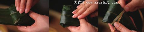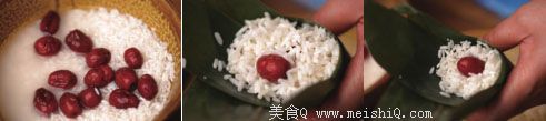 取一片粽叶卷成一个圆锥形,用糯米把圆锥填满,再加一颗大枣。用手压实米,将粽叶折叠盖住圆锥的底部,用棉线绑结实。