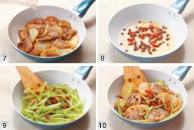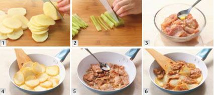 用盐和料酒、淀粉将肉片略加腌制备用。利用腌制的时间,在锅中放入 2 汤匙油,烧至五成热左右,将土豆放入煸至表面微黄后盛出备用。