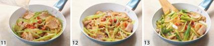 另起一锅,放入 1 汤匙油,烧至四成热,也就是手掌能感到些许热气的时候,将干红辣椒掰碎放入,加入花椒、大蒜爆香,然后放入青笋。炒匀后将刚才焯好的土豆、肉片放入。