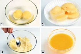将土豆去皮洗净后,切成片放入清水中浸泡一下,不用沥干水分后直接放入盘中,上锅蒸熟或者在微波炉中用高火正反两面各加热 4 分钟左右至熟软,盛出后碾成土豆泥。鸡蛋打开取蛋黄留用。
