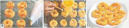 将搅拌好的土豆泥放入裱花袋中,烤盘中铺上一层油纸,将土豆泥挤在上面,刷上剩下的液态黄油,烤箱预热至 180℃,将其放入,用上下火烤制20 分钟左右即可。