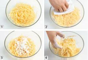 将土豆去皮洗净,然后擦成细丝,注意尽量擦短一些的丝,一会儿比较容易搅拌。将土豆丝冲洗后,尽量沥干水分,一定要充分沥干,然后撒入盐和面粉,边撒边翻匀,使每个土豆丝上都能裹匀一层面粉。