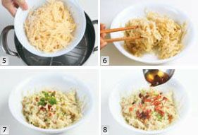 将这些土豆丝,放入盘中,上锅蒸 7~8 分钟即熟,盛出后,趁着冒热气的时候,把土豆丝迅速拨散,在上面撒上辣椒粉、葱末、蒜末。