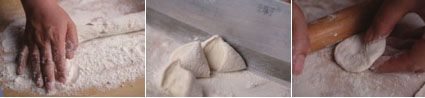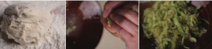 温水加入面粉中,缓慢地注入,用手将面粉打成雪花状的絮絮,然后将面粉絮絮揉成一团,盖湿布醒上半个小时后,揉光滑。