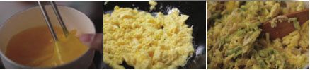 锅内入底油,将西葫芦丝炒软,盛出沥油待用。