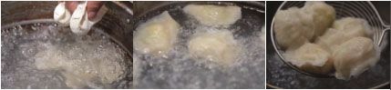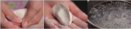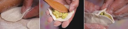 取一饺子皮,左手做碗状拿稳饺子皮,右手捏饺子边。放入适量的馅儿,对折,一捏,就成饺子了。锅中水烧开,放入饺子,大火煮开。