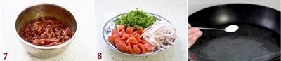 下姜蒜末炒匀。加入番茄丁炒软,下青椒丝炒匀。
